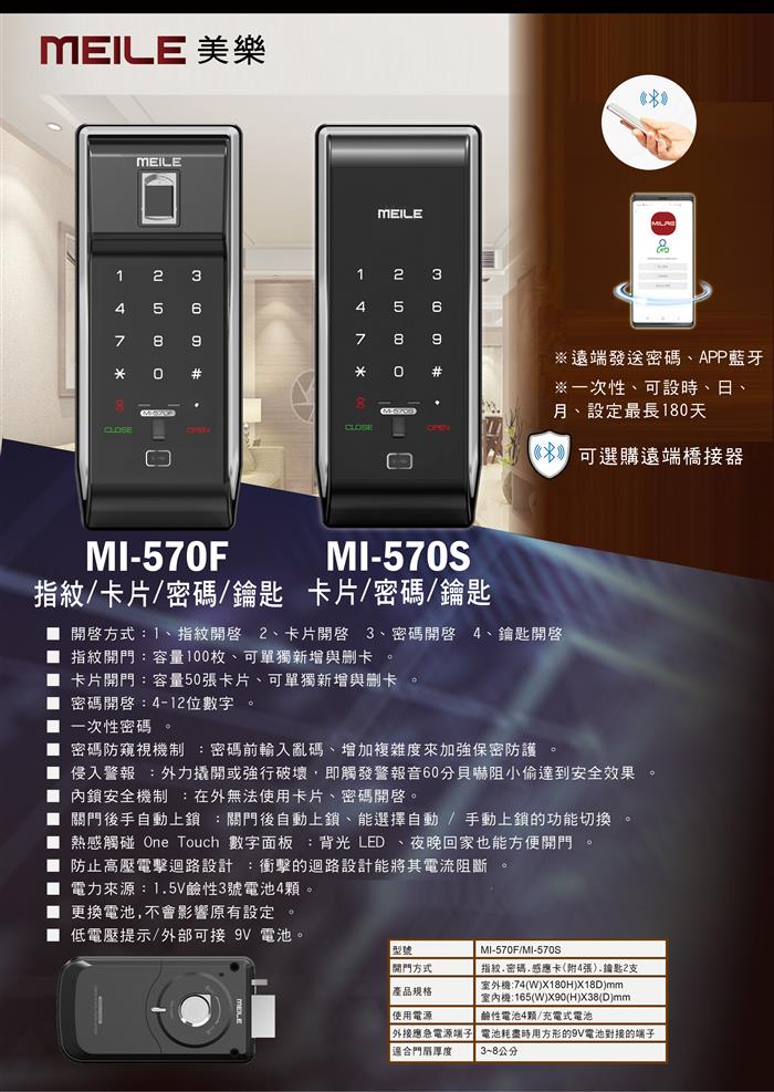 ■ 開啟方式:1、卡片2、密碼 3、 鑰匙■ 卡片系統:相容RFID悠遊卡感應系統、容量50張卡片、可單獨新增與刪卡 。■ 密碼開啟:4-12碼設定■ 密碼防窺視機制 :密碼前輸入亂碼、增加複雜度來加強保密防護 。■ 侵入警報 :外力撬開或強行破壞,即觸發警報音60分貝嚇阻小偷達到安全效果 。■ 內鎖安全機制 :在外無法使用指紋、卡片、密碼開啟。■ 關門後手自動上鎖 :關門後自動上鎖、能選擇自動 / 手動上鎖的功能切換 。■ 熱感觸碰 One Touch 數字面板 :背光 LED 、夜晚回家也能方便開門 。■ 防止高壓電擊迴路設計 :衝擊的迴路設計能將其電流阻斷 。■ 電力來源:1.5V鹼性3號電池4顆。■ 更換電池,不會影響原有設定 。■ 低電壓提示/外部可接 9V 電池。